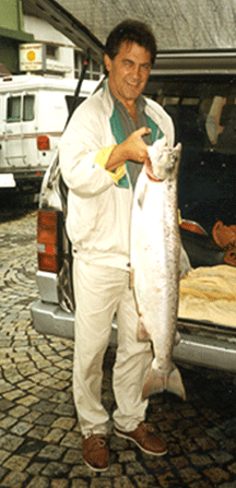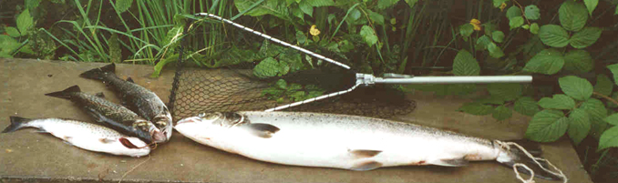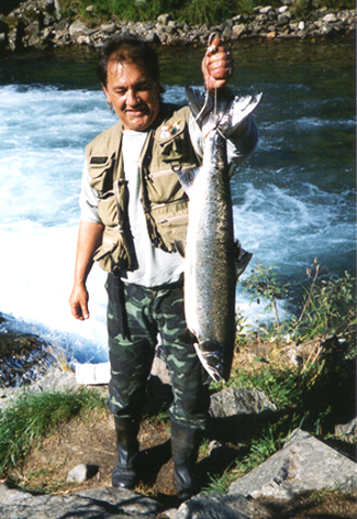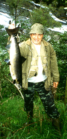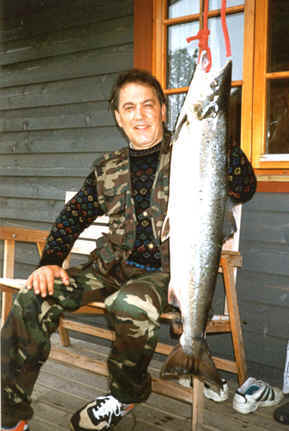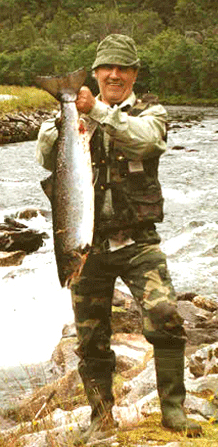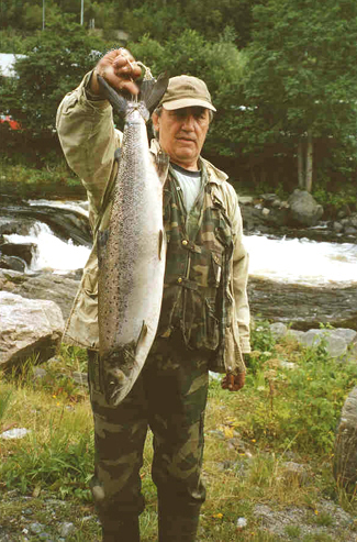 siste laksen ( 3,6 kg. ) i elva, på siste fiske dag den 30 september 2002 kl. 19.00!!! |